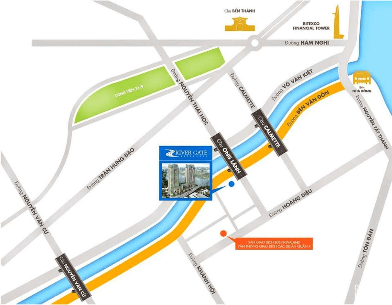 Ong Lanh Bridge is the bridge that directly connects the project with Vo Van Kiet Avenue, from which you can turn straight to Ben Thanh Market, Nguyen Hue walking street or major roads such as Ham Nghi, Nam Ky Khoi Nghia. Moving from Rivergate apartment to districts such as District 1, District 3, District 5 or even Thu Duc is also extremely convenient, thanks to the expanding transportation network of both roads and future Metro lines.
